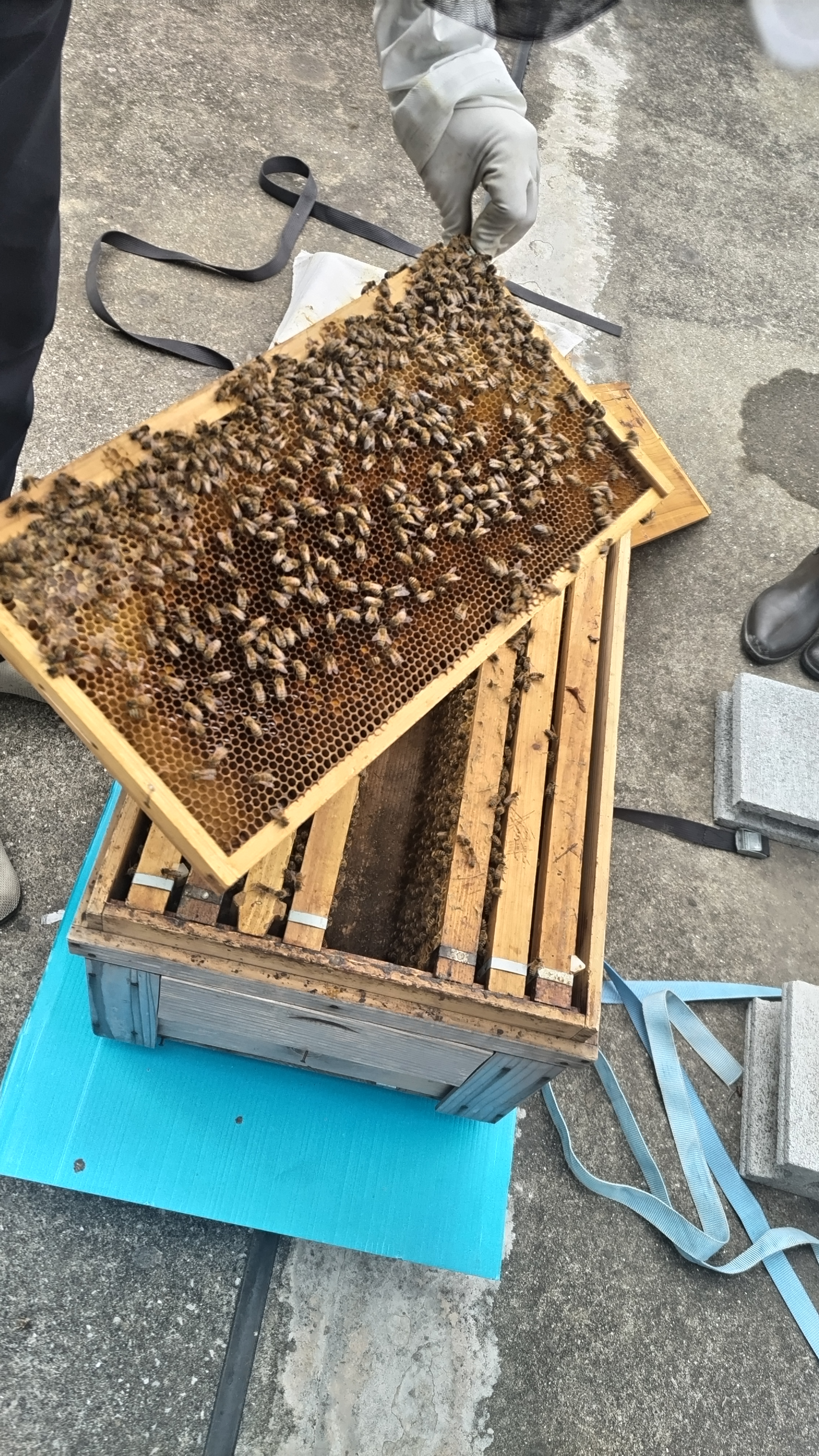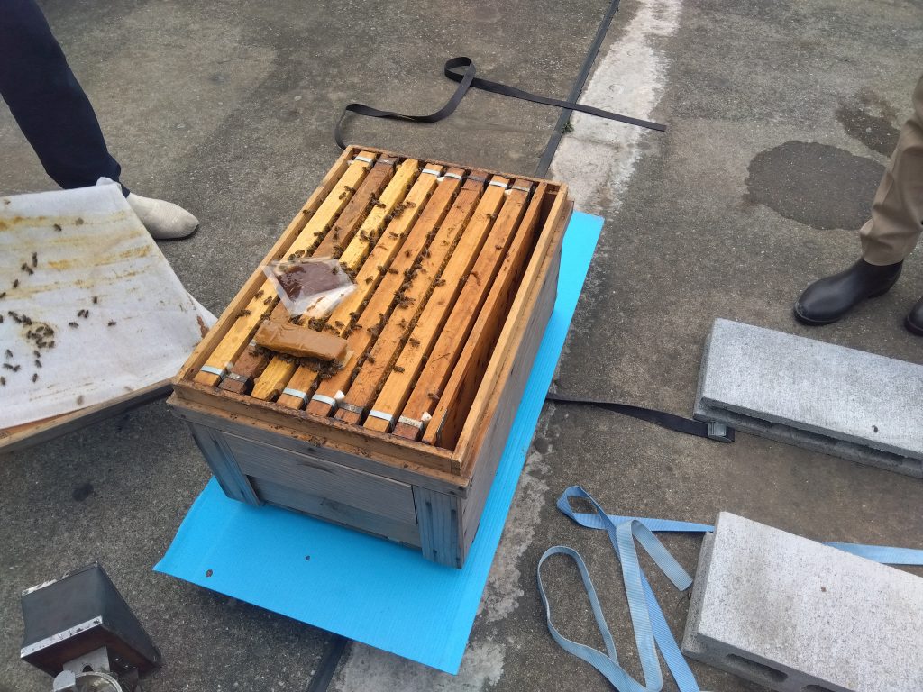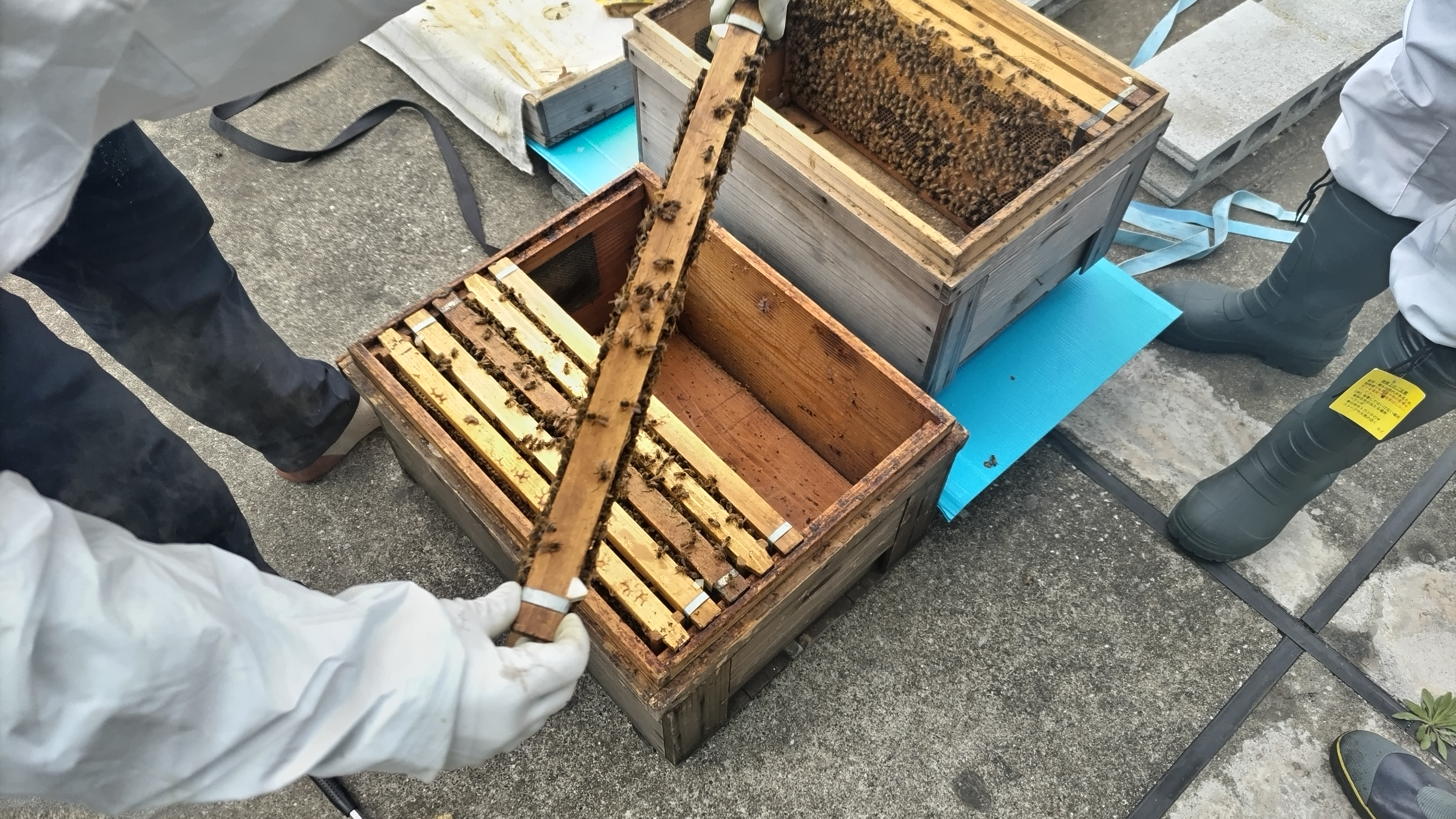 来週は、別の巣箱に、卵の巣枠や若い雄蜂、餌などを仕立て、群を増やすよう準備を行います。